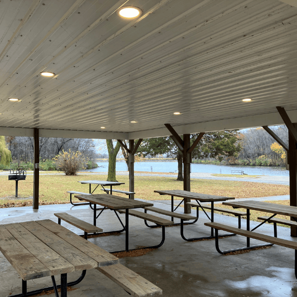 This open-air shelter is located on the far East end of Rodgers Park. Access to an ADA accessible fishing pier.