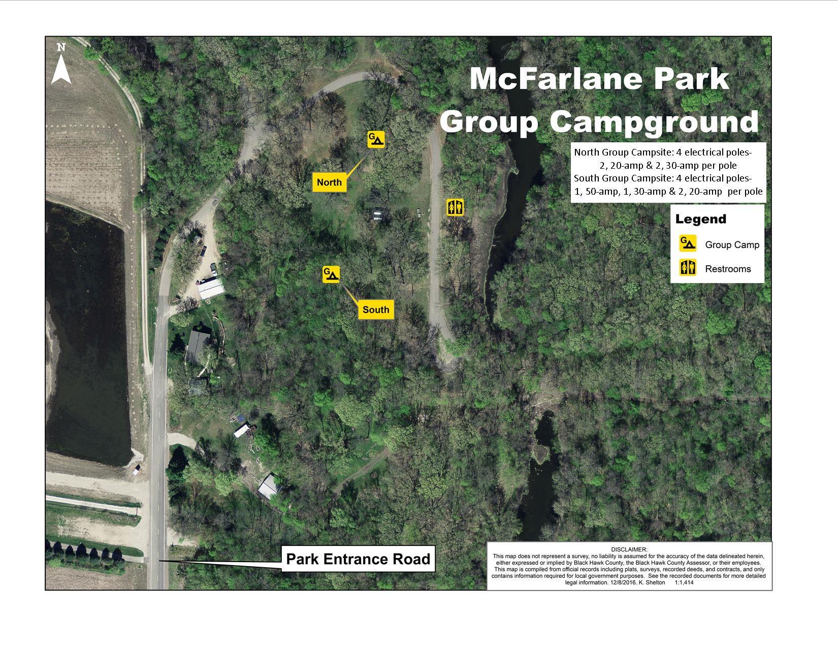 The McFarlane Park Group Camp area provides two separate group camps. The North Group Camp has 4 electric poles each with 2 - 30 amp outlets and 2 - 20 amp outlets. The South Group Camp has 4 electric poles each with 1 - 50 amp outlet, 1 - 30 amp outlet and 2 - 20 amp outlets. A water hydrant is also available to fill holding tanks. A pit toilet is available within this group camp area and campers are welcome to use the shower/safe room facility located in the center of the main campground.