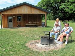 The cabins' comforts and amenities are complimented by natural beauty, park attractions, and promotion of a sustainable lifestyle. Each cabin comfortably sleep five, with two private bedrooms, kitchenette, and a private bathroom with shower. There are vaulted ceilings, wood-sided interiors, and exterior wood siding from trees harvested in Buchanan County. Each cabin includes a porch, table, grill, and fire ring.  A private drive for cabin users provides access to the cabins.  The cabins are situated near the woodland trails and prairie on the northwest part of the park.