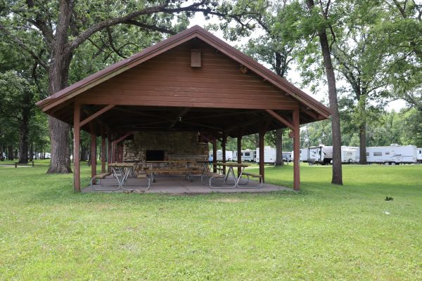 This shelter has electricity, a double-sided fireplace, and picnic tables.