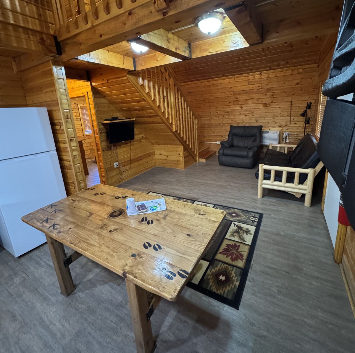 Muskie Cabin's amenities include a full kitchen, a full bathroom with a walk-in shower, a comfortable living area, and an upstairs loft. The kitchen is equipped with all necessary appliances, including a full-sized refrigerator, oven/stove, microwave, toaster, coffee maker, and a kitchen table with chairs. Meanwhile, the living area features a television, futon, recliner, and air conditioning.