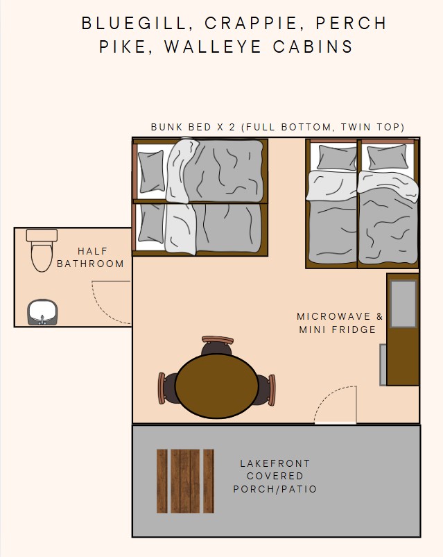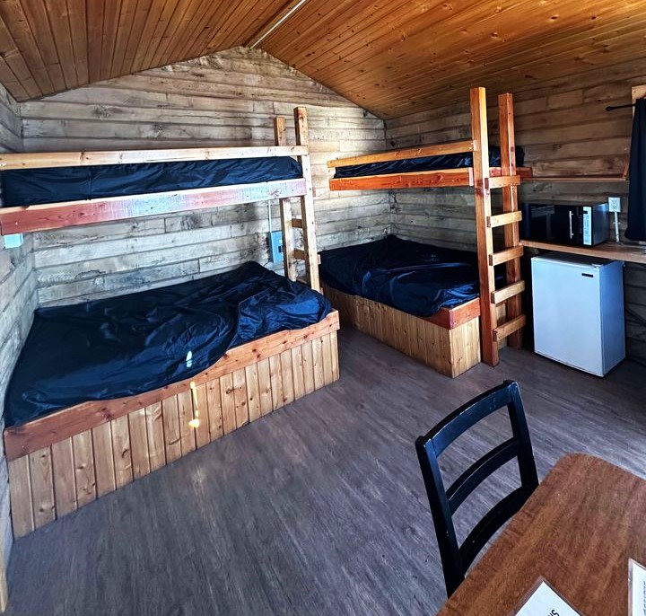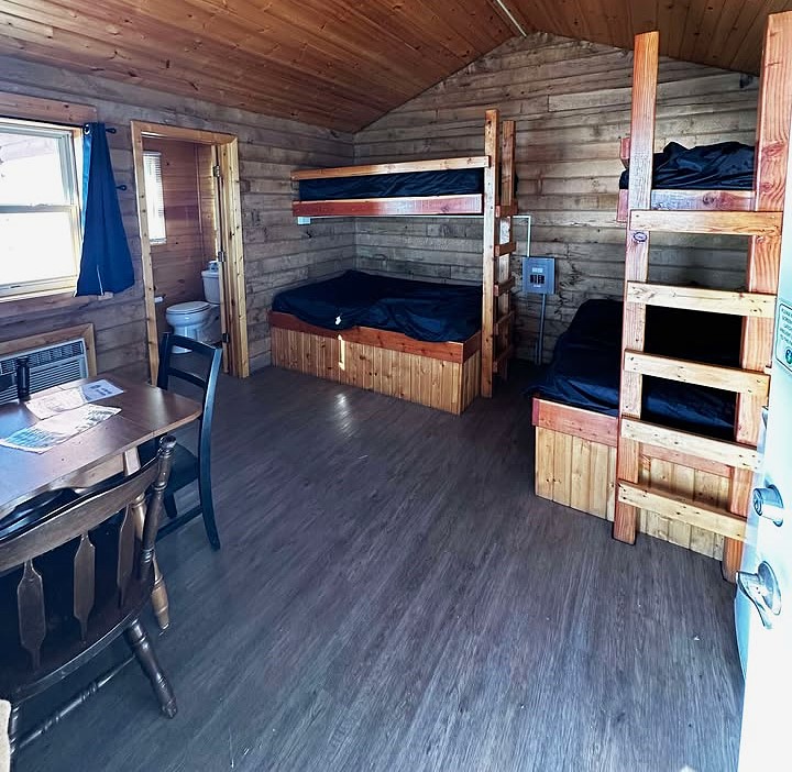 Featherstone Memorial Park is home to five cozy, small cabins, and Cabin Pike is a favorite among visitors. Located just yards from the water's edge of North Twin Lake, this cabin offers stunning views. Cabin Pike comfortably accommodates six guests, with two full beds and two twin beds. (there are two bunk beds, each with a full and twin mattress) The cabin is equipped with a kitchen table and chairs, a microwave, a mini-fridge, an AC/heat unit, and a bathroom with a flush toilet and sink.