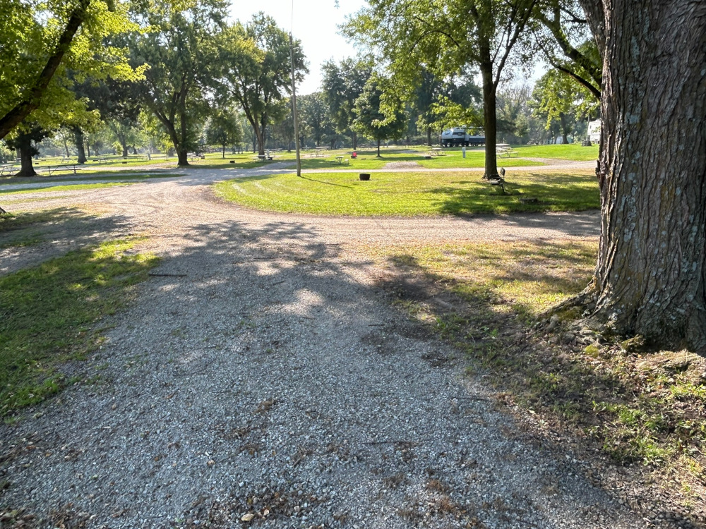 This site is a back-in 10' x 50' gravel pad equipped with 20/30/50 Amp service. It has a partially shaded grassy area that contains a fire ring and picnic table.