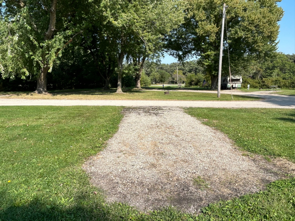 This site is a back-in 10' x 36' gravel pad equipped with 20/30/50 Amp service. It has a full sun grassy area that contains a fire ring and picnic table.