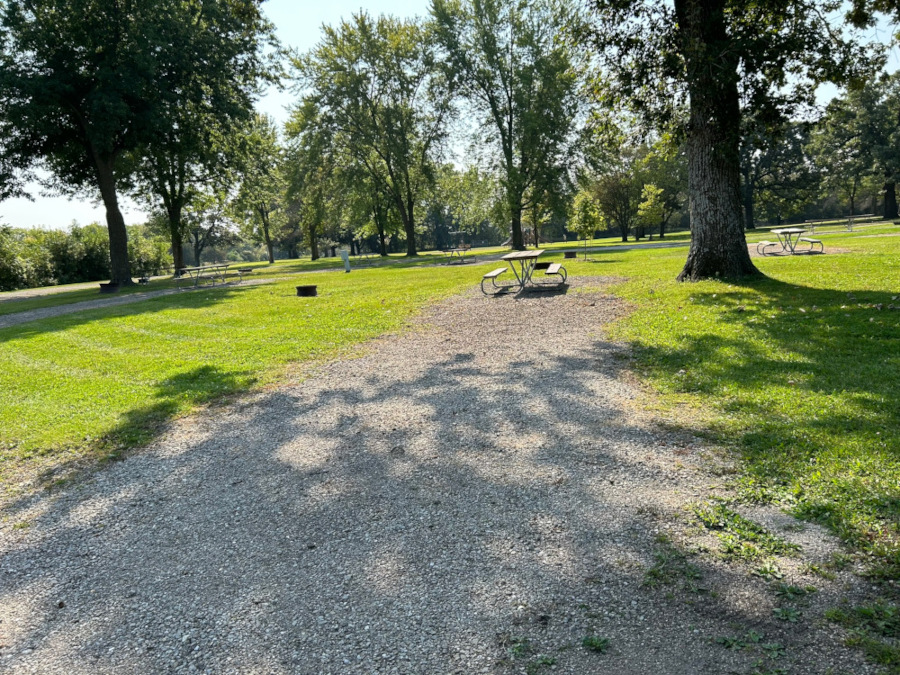 This site is a back-in 12' x 50' gravel pad equipped with 20/30/50 Amp service. It has a partially shaded grassy area that contains a fire ring and picnic table.