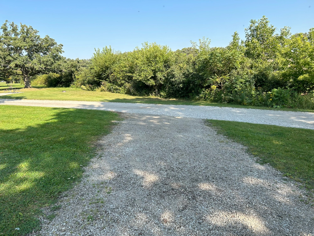 This site is a back-in 12' x 53' gravel pad equipped with 20/30/50 Amp service. It has a partially shaded grassy area that contains a fire ring and picnic table.