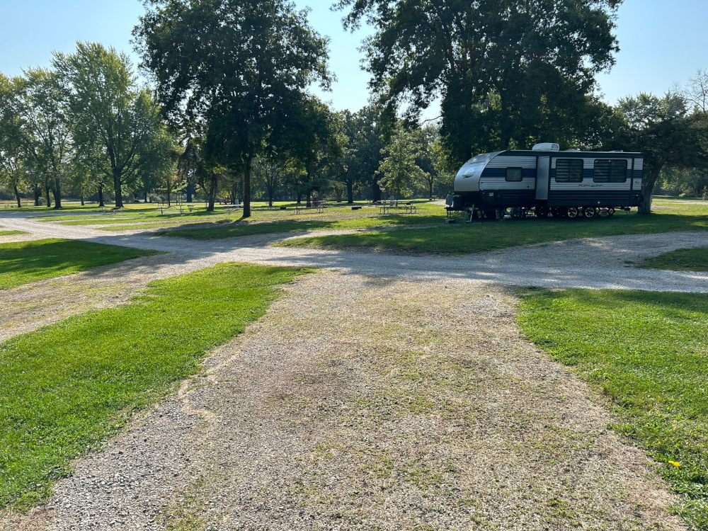 This site is a back-in 12' x 38' gravel pad equipped with 20/30/50 Amp service. It has a mostly sunny grassy area that contains a fire ring and picnic table.