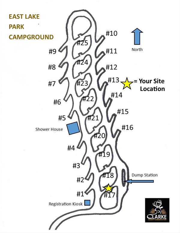 East Lake Campround is located on the northeast corner of East Lake Park. When pulling in the drive of East Lake Park, go straight up the hill and continue straight.