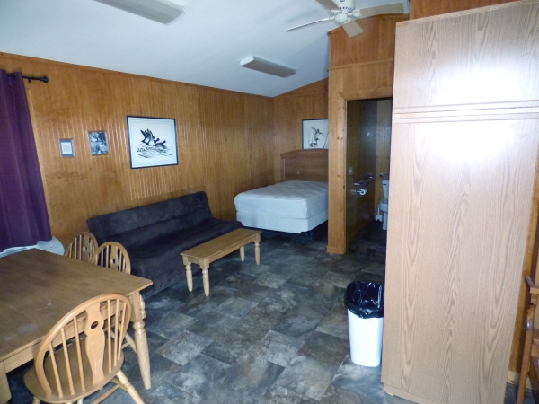 Cabin 2 is a single room cabin that sleeps up to 6 people. The Yellow Smoke cabins are located overlooking the lake and beach area. There is a modern restroom and shower as well as a kitchenette. Note: this was Cabin 2 prior to 2021 and changed after the addition of our 3-bedroom cabin which is now cabin 1.