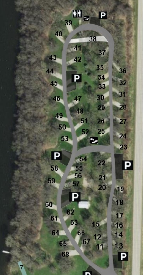 Site 65 is a gravel pad site with 50/30/20amp electrical service. The site is 41' long by 18' wide.