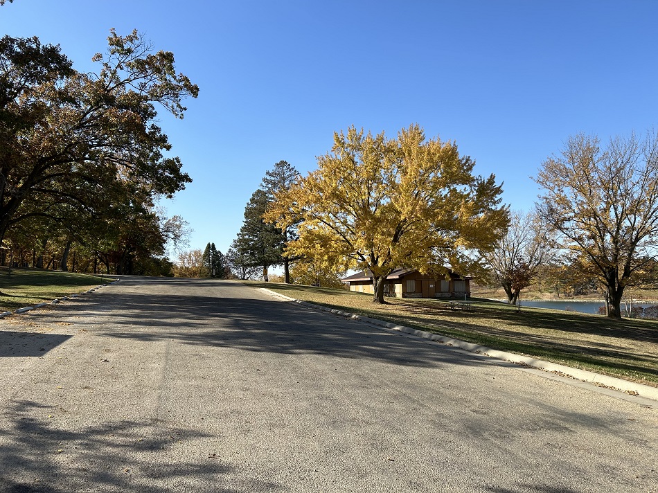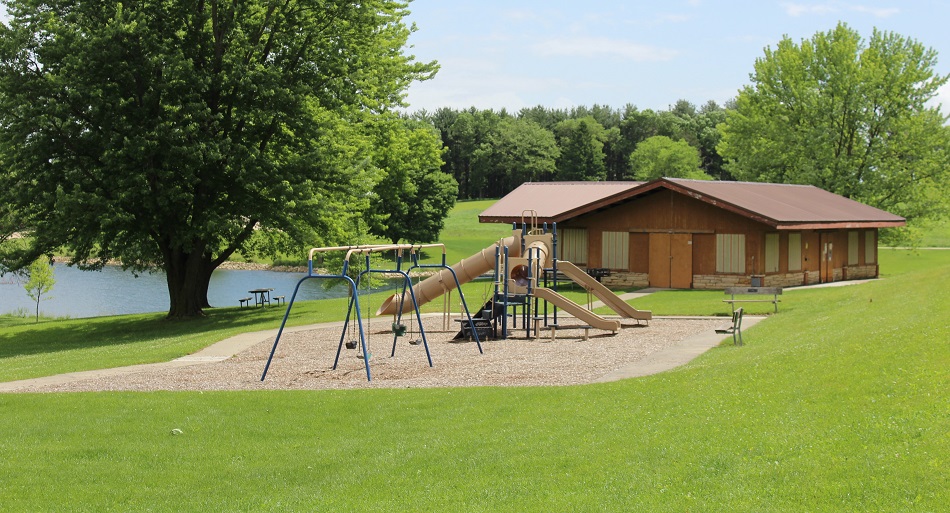 10-15 picnic tables provide enough seating for around 75 people. The building has electricity and a water hydrant is located out the east doors. Several standing charcoal grills are located in grassy areas around the outside of the building. On warm summer days the window coverings can be lifted for maximum air flow. Kids can keep busy at the playground area located out the west doors or at the park's swimming area or at the sand volleyball court. All are within walking distance of the shelter.