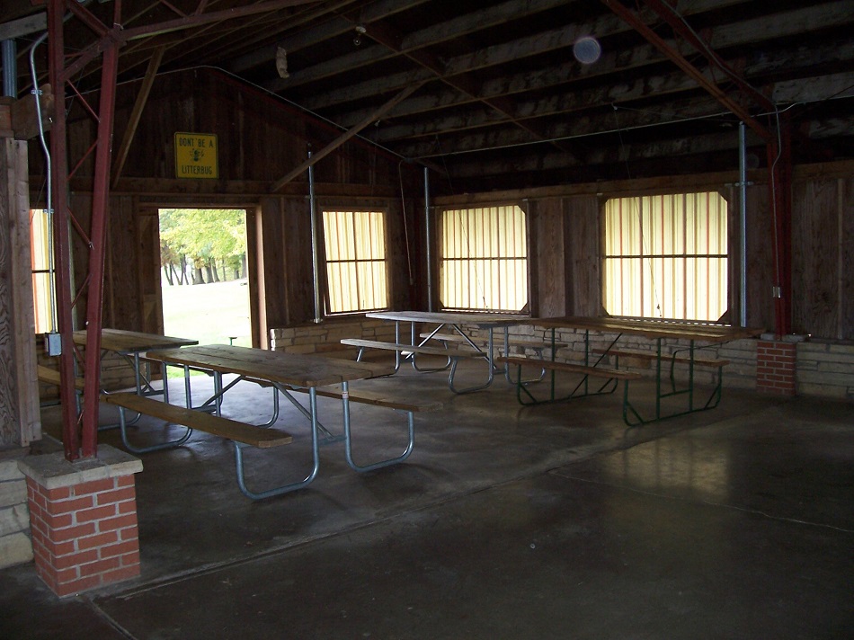 Fifteen picnic tables provide enough seating for around 75 people. The building has electricity and a water hydrant is located out the east doors. Several standing charcoal grills are located in grassy areas around the outside of the building. On warm summer days the window coverings can be lifted for maximum air flow. Lawn chairs or bags chairs can be set up for alternative seating.