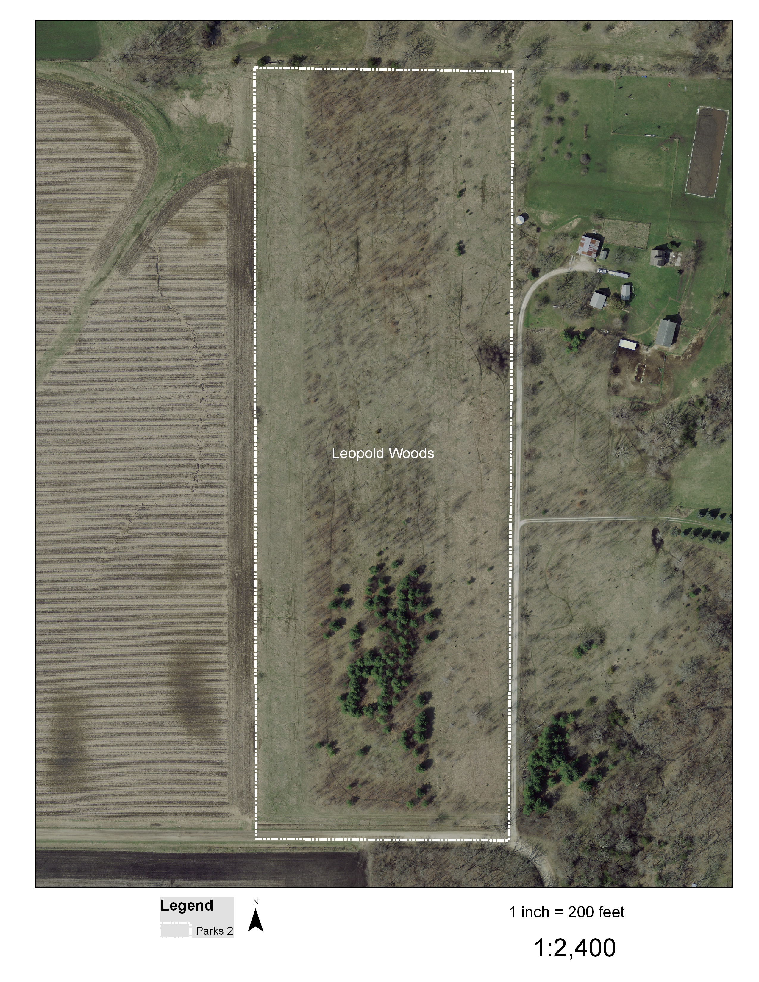 Leopold Woods is a wildlife refuge acquired from Don Norton in February 2010. The tract includes small areas of cool season and prairie grassland and planted 20-year-old trees. A small parking area is provided, but no other improvements are allowed on the area due to deed restrictions.