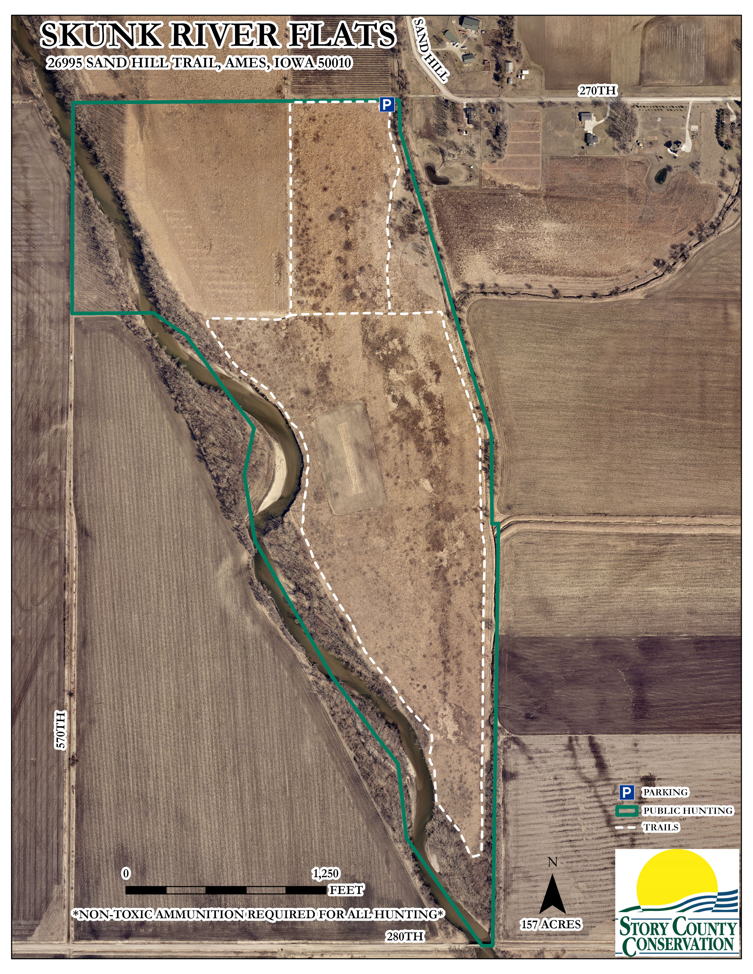 The Skunk River Flats is a 117-acre public hunting area. It is owned by the Iowa DNR but managed by SCC. It was purchased through the Natural Resource Conservation Services wetlands program. A small area of floodplain forest is present near the Skunk River, but the area is mostly reconstructed prairie with a small restored wetland. Hiking, walking, bird watching, geocaching, and several other activities are possible however we do not maintain trails (other than a mowed perimeter path) nor do we have picnic tables or grills available.