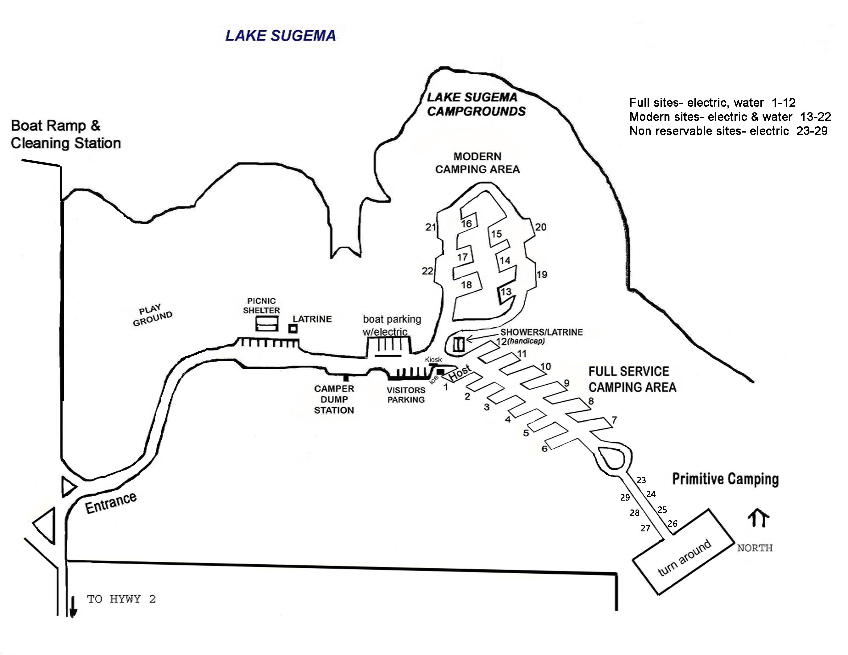 Turn right at the entrance drive of Lake Sugema before you get to the boat ramp.  This will take you past the shelter and cabins to the beginning of the campgrounds.