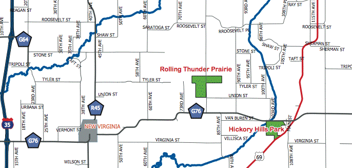 Rolling Thunder State Preserve is a 282 acre wildlife management area, remnant prairie, purchased in three tracts. The original 122 acres was purchased in 1981, eighty acres was purchased in 1991 and a second eighty was purchased in 1992. All three purchases were made with assistance from the Wildlife Habitat Fund, a very competitive grant program financed by the Wildlife Habitat Fee, required with the purchase of an Iowa hunting license. A rolling area with a wooded creek, that area consists mainly of grasses and forbs. It is used extensively by a variety of upland and woodland species. The two hundred acres on the west side of 80th Avenue have never been plowed and contain high quality native prairie vegetation.