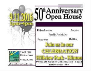 To celebrate this milestone, the Plymouth County Conservation Board will be having an open house at Hillview Recreation Area on September 11, 2016 from 1pm-4pm. Guests will have a chance to listen to a program about the resident elk herd, take a hike through the woods, try out the canoes and kayaks, visit with past and present conservation board and staff members or take a gator ride around the park. We will even have a bounce house for the kids! All the activities will center around and in our Center for Outdoor Learning.